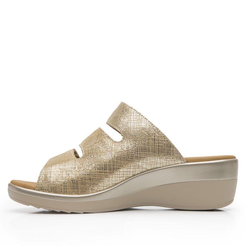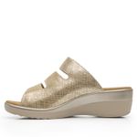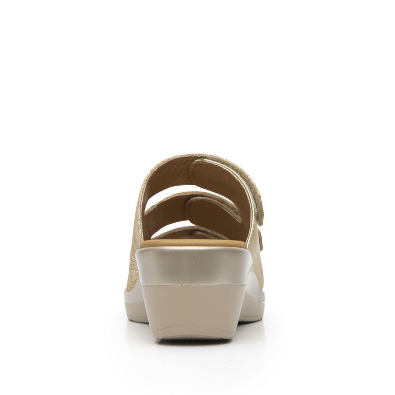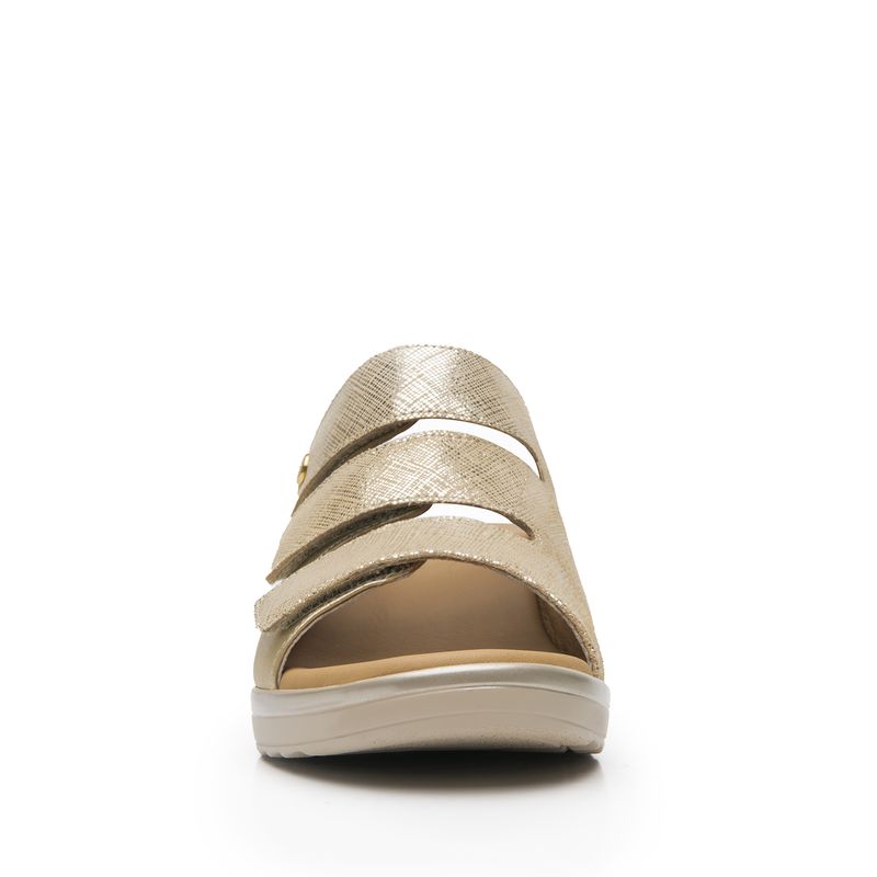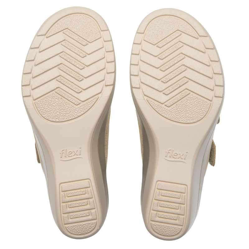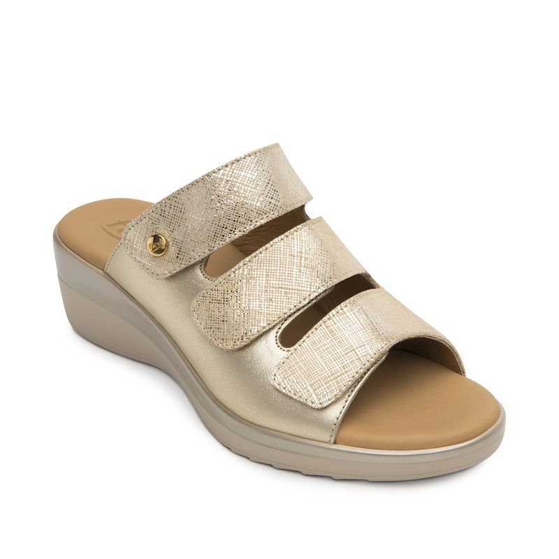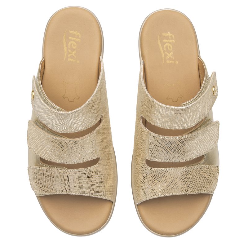 Sandalia Mujer Amapola 116022 Dorada. Sandalia cuña baja elaborada en cuero que cuenta con el sello de comodidad y estilo de zapatos Flexi. Este producto forma parte de nuestra línea de sandalia para dama con combinación de materiales y suela de cuña con contraste de textura, luce actual y con gran confort por su plantilla acojinada de cuero. Este calzado cuenta con velcro, suela de pu, plantilla de cuero y forro de cuero. Altura máxima 5.2cm. SKU: 116022ORO