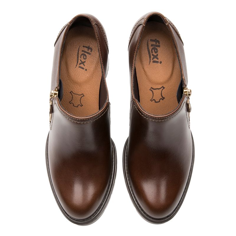 Bootie Mujer Carline 137102 Café Oscuro. Zapato tipo bootie elaborada en cuero natural que cuenta con el sello de comodidad y estilo de zapatos Flexi. Este producto forma parte de nuestra línea de botines con altura y estilo. Su tacón ancho y su suela dentada te brindarán la estabilidad y comodidad para estar a la moda, cómoda y segura. Están hechos de piel, con un aspecto natural y gran calidad. Este calzado cuenta con una suela de abs - tpu / tpk, una plantilla de cuero y forro ecocuero. Altura de tacón 7.8cm. SKU: 137102DARKTAN