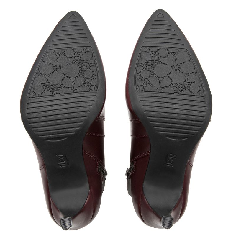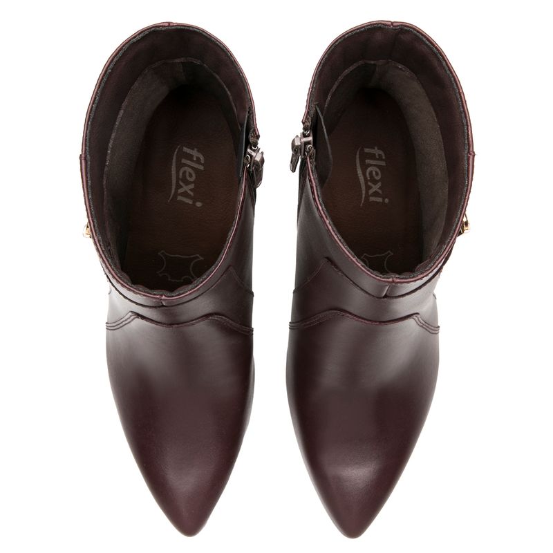 Botín Mujer Idris 104522 Burdeo. Botín puntal de tacón elaborado en cuero natural que cuenta con el sello de comodidad y estilo de zapatos Flexi. Este producto forma parte de nuestra línea de dama semiformal de horma puntal, un "must" para la temporada que da un look moderno y elegante. Esta temporada se renueva con cortes y detalles metálicos, además de un estilo con puntera que destacan como tendencia este Otoño / Invierno. Este calzado cuenta con una suela de abs / hule, una plantilla de cuero y forro textil. Altura del tacón 7.4cm SKU: 104522VINO