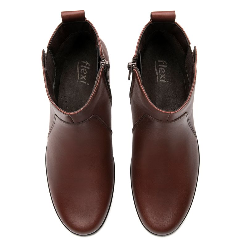 Botín Mujer Karime 18135 Café. Botín confort elaborado en cuero natural que cuenta con el sello de comodidad y estilo de zapatos Flexi. Este producto forma parte de nuestra línea de dama casual de diseño clásico. Ofrece gran comodidad debido a su construcción de inyección directa, lo que lo hace ligero y flexible. Este calzado cuenta con una suela de pu, una plantilla de cuero y forro textil. SKU: 18135CAFE