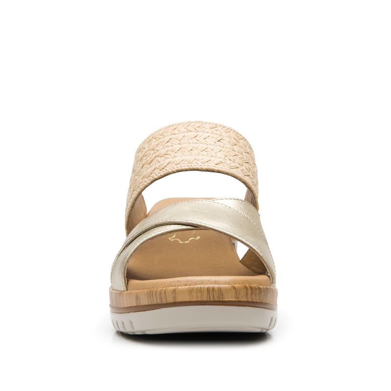 Sandalia Mujer Emily 113324 Dorada. Sandalia de plataforma elaborada en cuero que cuenta con el sello de comodidad y estilo de zapatos Flexi. Este producto forma parte de nuestra línea de sandalias casuales cuyos materiales brindan un estilo único y vanguardista. Su propuesta de color y materiales tejidos en tendencia serán clave para esta temporada, así como su plataforma con contraste de texturas. Este calzado cuenta con una suela de pu, plantilla de cuero y forro de cuero. Altura máxima 6.4 cm. SKU: 113324DORADO