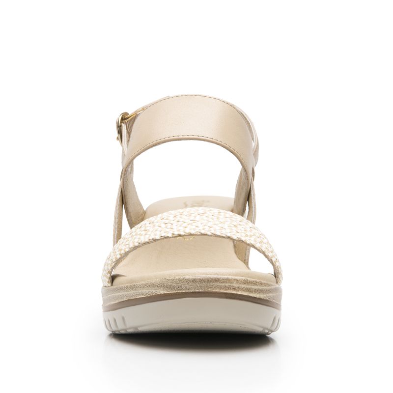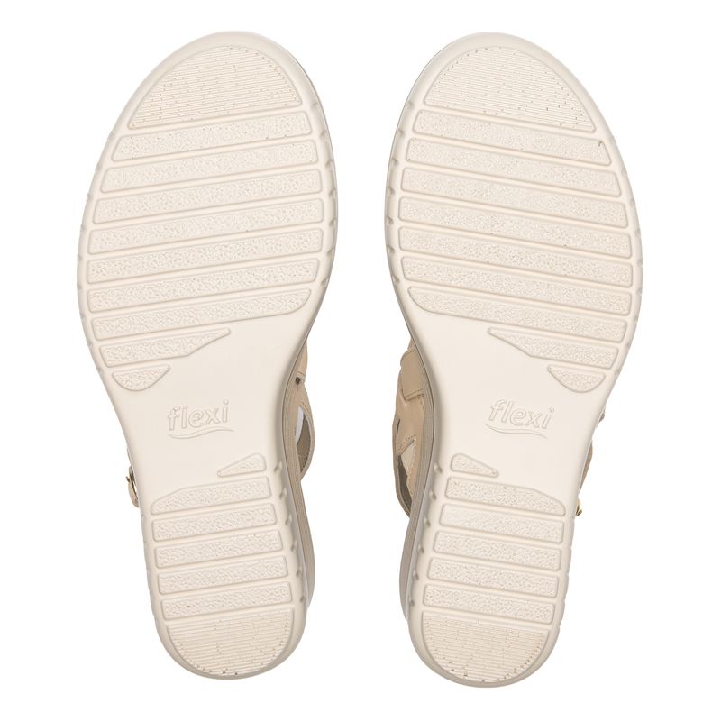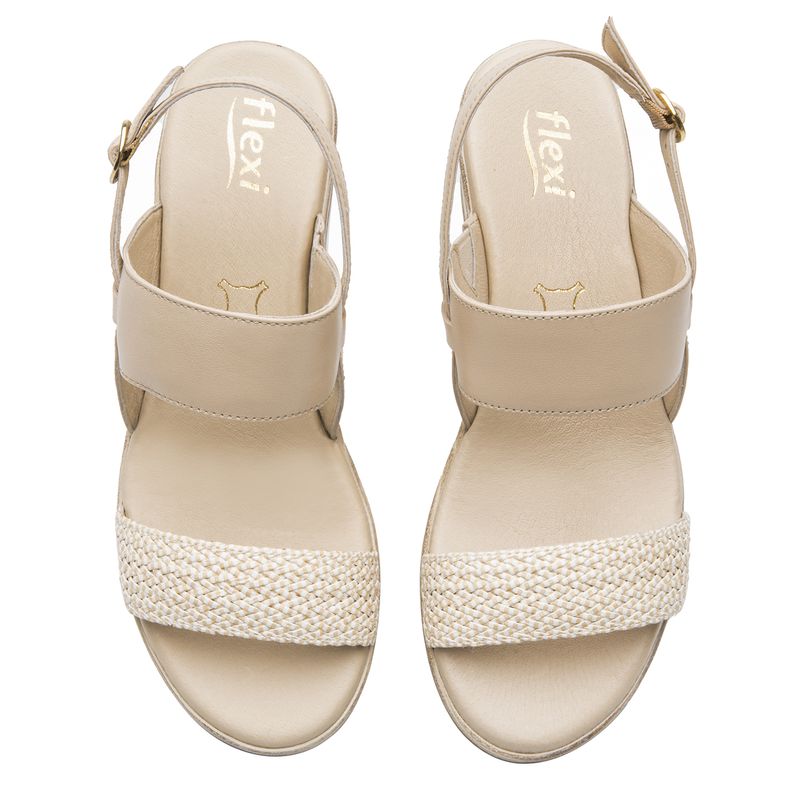 Sandalia Mujer Emily 113325 Blanco Crema. Sandalia de plataforma elaborada en cuero que cuenta con el sello de comodidad y estilo de zapatos Flexi. Este producto forma parte de nuestra línea de sandalias casuales cuyos materiales brindan un estilo único y vanguardista. Su propuesta de color y materiales tejidos en tendencia serán clave para esta temporada, así como su plataforma con contraste de texturas. Este calzado cuenta con hebilla, suela de pu, plantilla de cuero y forro de cuero. Altura máxima 6.4 cm. SKU: 113325CREMA
