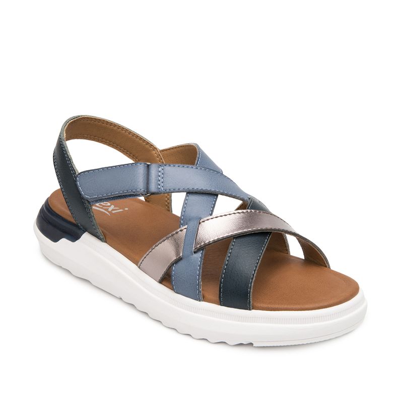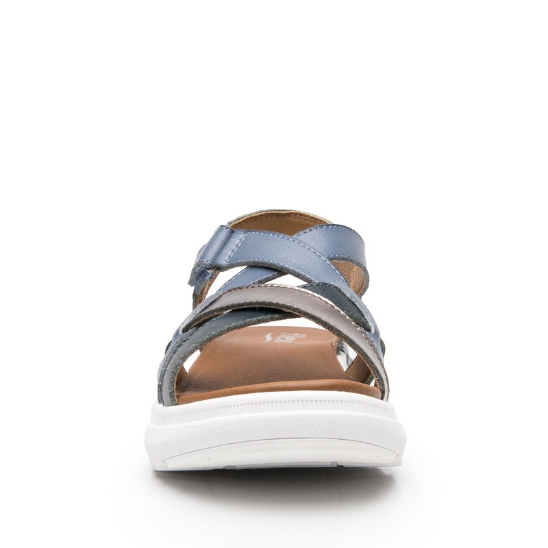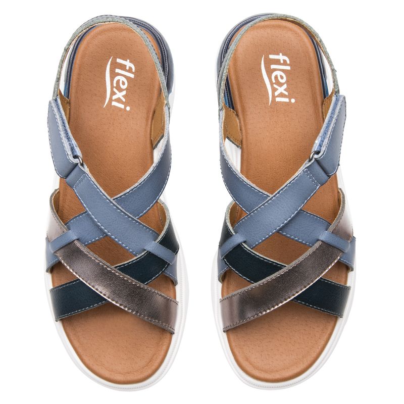 Sandalia Mujer Fraga 129403 Azul. Sandalia de confort elaborada en ecocuero que cuenta con el sello de comodidad y estilo de zapatos Flexi. Este producto forma parte de nuestra línea de sandalias cómodas y ligera en cada paso. Sus diseños cuentan con velcros para auto ajustarse a tu pie y materiales en tendencia como metálicos y tejidos. Este calzado cuenta con una suela de eva / gel, una plantilla de cuero y forro ecocuero. Atura 3.9 cm. SKU: 129403AZUL