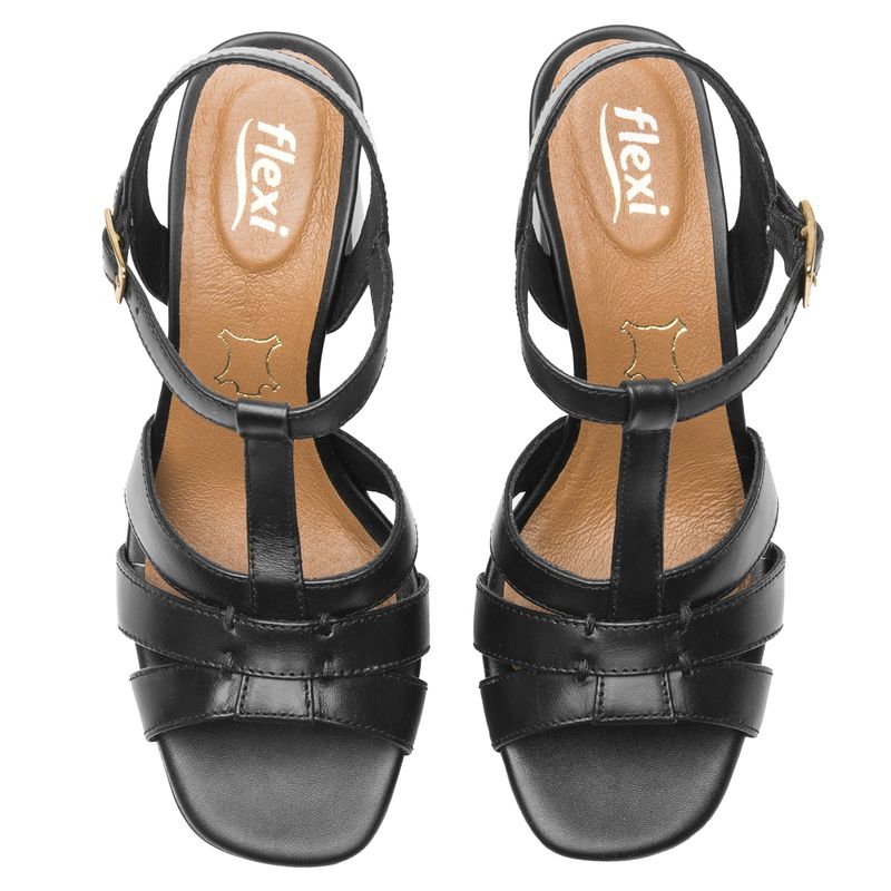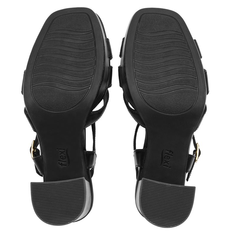 Sandalia Mujer Katnis 134401 Negra. Sandalia tacón alto (9.3 cm) elaborada en cuero que cuenta con el sello de comodidad y estilo de zapatos Flexi. Este producto forma parte de nuestra línea de sandalia con silueta elegante que destaca por su propuesta de color y estilo multi tiras con pulsera al tobillo que brinda un mejor agarre. Es hecha de cuero y cuenta con una pequeña plataforma (1 cm) al frente que brinda mayor comodidad al caminar. Este calzado cuenta con hebilla, suela de abs - tpu / pu - hule, una plantilla de cuero y forro ecocuero. SKU: 134401NEGRO
