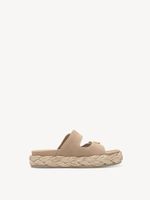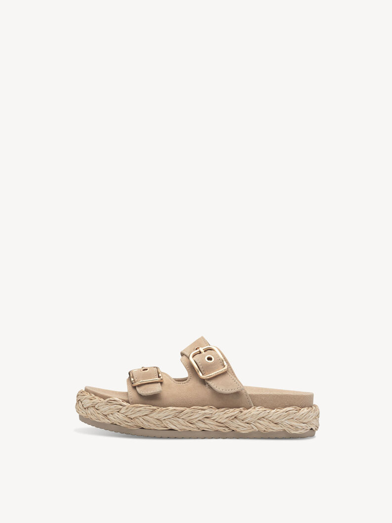 Sandalia Mujer Tamaris 27412-44 Café. Esta sandalia confeccionada en cuero tipo mule luce un diseño veraniego y natural en color beige, perfecta para los días cálidos o para looks relajados. Cuenta con dos tiras anchas ajustables con hebillas metálicas doradas, que le aportan estilo y funcionalidad.