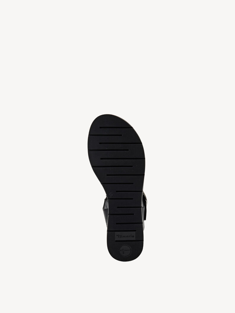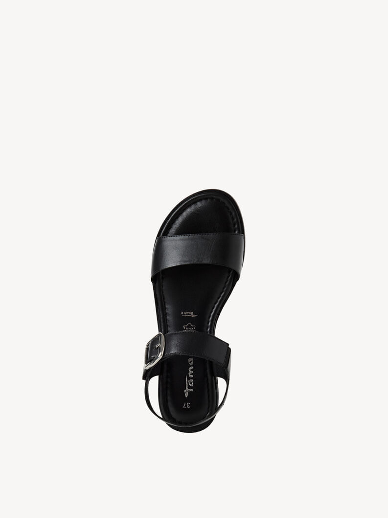 Sandalia Mujer Tamaris 28133-44 Negra. Esta sandalia plana confeccionada en cuero, combina elegancia y sencillez, perfecta para el verano o para looks casuales y urbanos. Está diseñada con dos tiras anchas, una para el empeine y otra con hebilla metálica para asegurar el tobillo, brindando un ajuste cómodo y seguro.