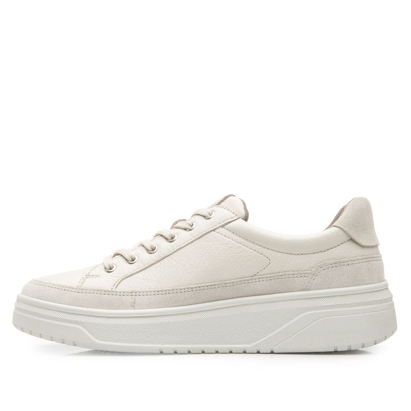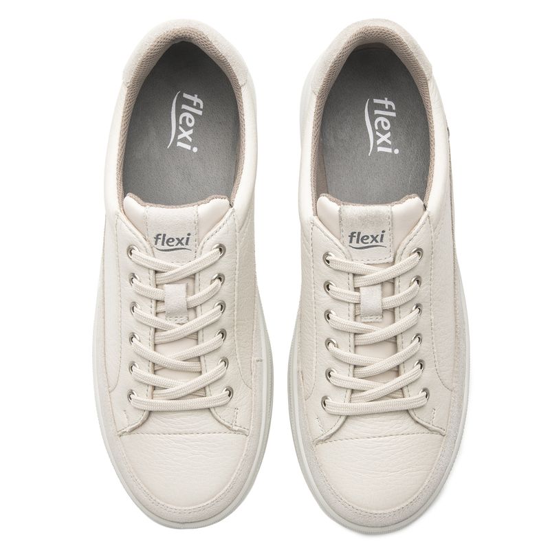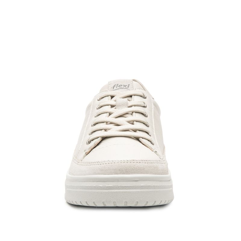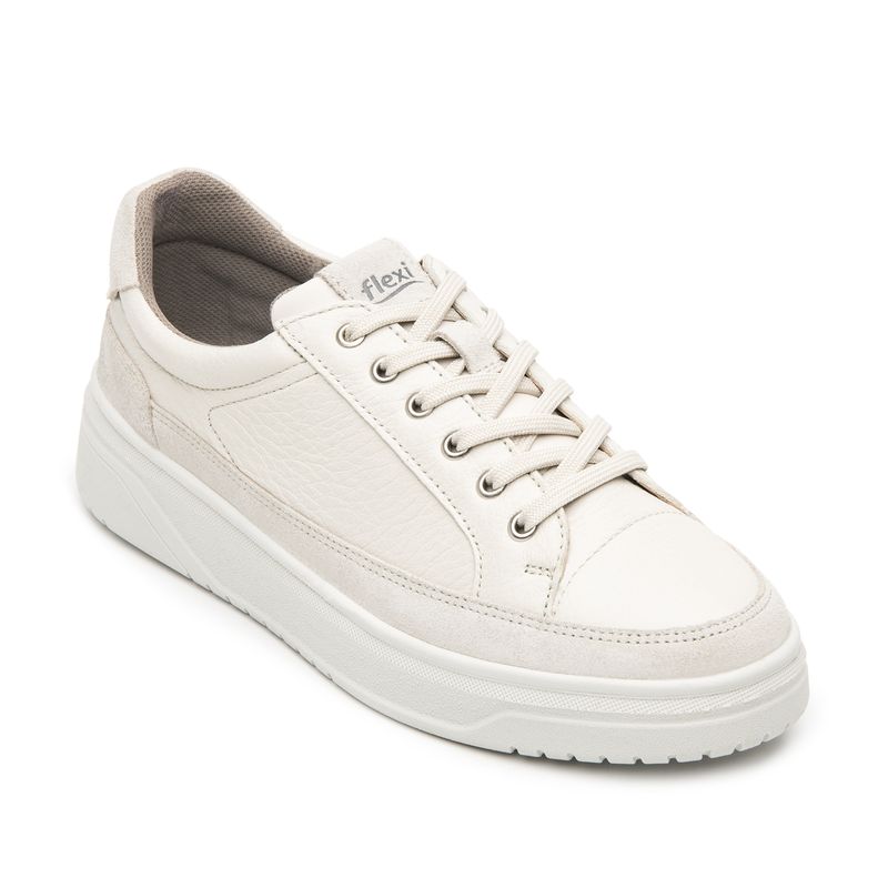 Zapatilla Mujer Helina 136602 Blanco Marfil. Zapatilla casual elaborada en cuero que cuenta con el sello de comodidad y estilo de zapatos Flexi. Este producto forma parte de nuestra línea de dama con diseños de zapatillas casuales, hechos de cuero y con un look simple y moderno. Su propuesta de colores básicos y neutros los hacen fáciles de combinar y llevar a todas horas. Su suela da un poco de altura y gran comodidad. Este calzado cuenta con cordones, suela de pu, una plantilla de cuero y forro textil. SKU: 136602HUESO
