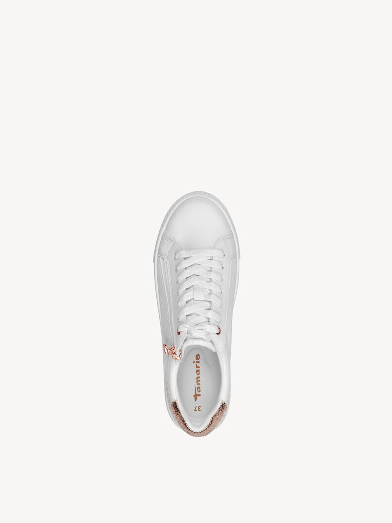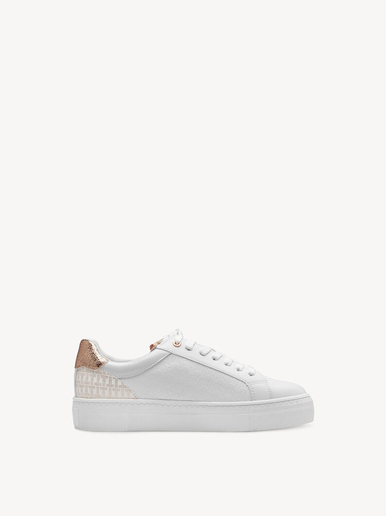 Zapatilla Mujer Tamaris 23313-41 Blanca. Estas zapatillas son ideales para quienes buscan comodidad y estilo en su día a día. Su color blanco las hace muy fáciles de combinar con cualquier ropa, y el diseño moderno destaca por los detalles en relieve sobre los laterales y el toque metálico en la cremallera lateral. La suela gruesa aporta soporte, y el refuerzo en el talón en tono dorado añade un aspecto elegante y diferente. El cierre con cremallera permite ponerlas y quitarlas rápidamente, mientras que los cordones ajustan perfectamente al pie. Son perfectas para completar un look casual y fresco. SKU: 2331341BLANCOROSA