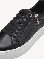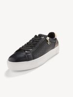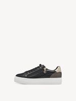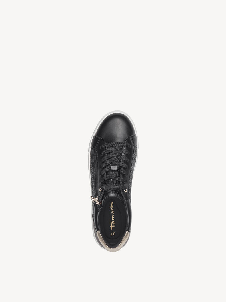 Zapatilla Mujer Tamaris 23313-41 Negra. Estas zapatillas son perfectas para el día a día. Su diseño en color negro combina con todo, y la suela blanca le da un toque moderno. Tienen detalles en relieve y una cremallera lateral que las hace fáciles de poner y quitar. El refuerzo dorado en el talón les da un toque original y elegante. Son cómodas, versátiles y resistentes, ideales para caminar por la ciudad, ir a la universidad o salir con amigos. SKU: 2331341NEGROORO