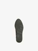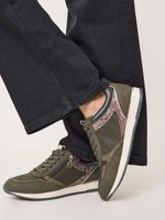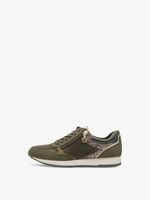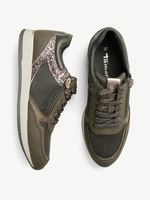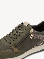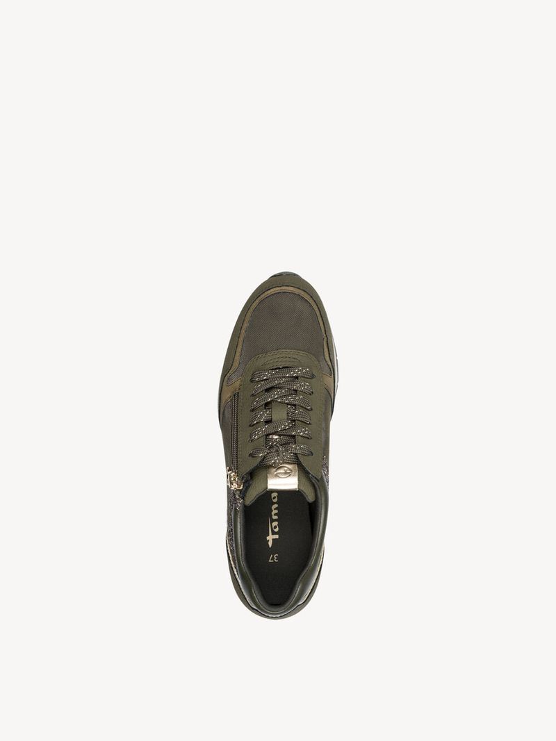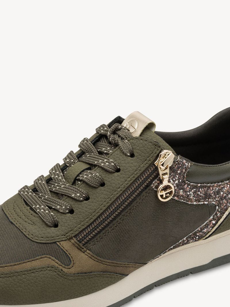 Zapatilla Mujer Tamaris 23603-42 Verde Olivo. Estas zapatillas en tono verde combinan practicidad y estilo para el día a día. Su diseño incluye paneles con textura, detalles de glitter rosado en los laterales que aportan un toque llamativo y femenino, y una cremallera lateral metálica para facilitar su uso.