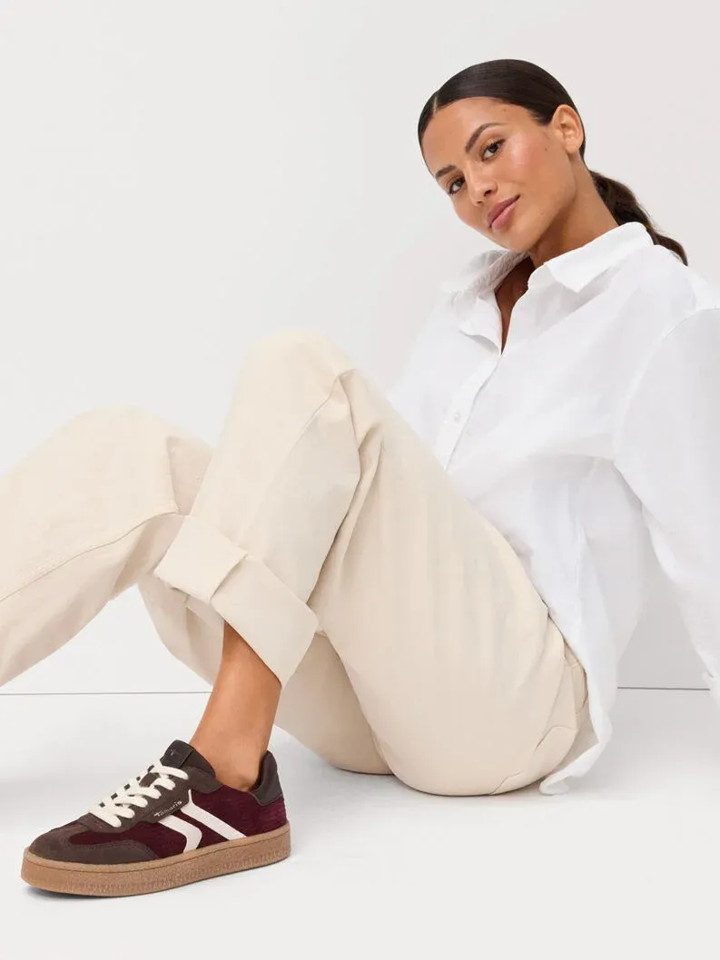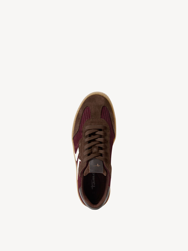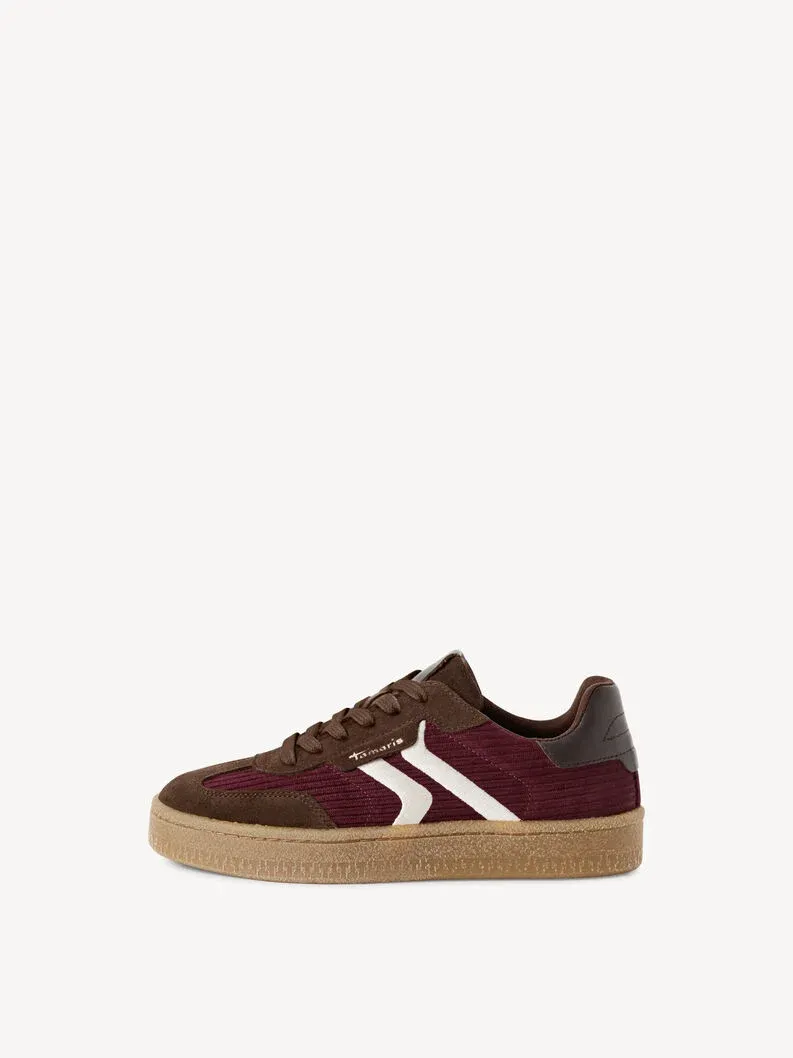 Zapatilla Mujer Tamaris 23723-44 Burdeo. Estas zapatillas confeccionadas en cuero destacan por su estilo retro y deportivo, perfectas para quienes buscan un look casual con personalidad. Combinan materiales en tonos marrón y burdeos, con detalles en blanco que forman líneas en los laterales, aportando dinamismo al diseño.