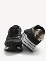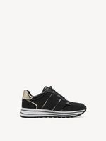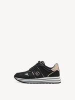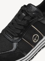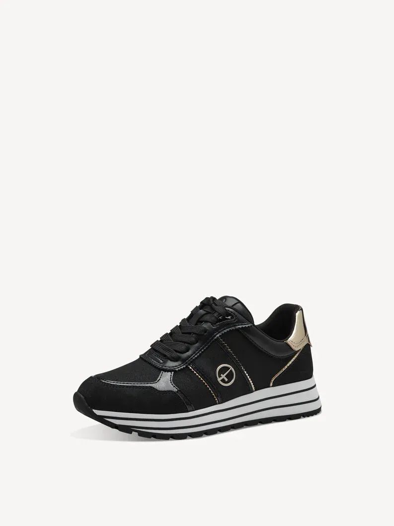Zapatilla Mujer Tamaris 23727-42 Negra. Estas zapatillas presentan un diseño deportivo y elegante, con detalles en charol y costuras metálicas en dorado que aportan un toque sofisticado. El logo de la marca destaca en el lateral, y el refuerzo dorado en el talón crea un contraste moderno y atractivo.