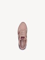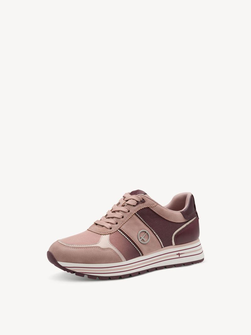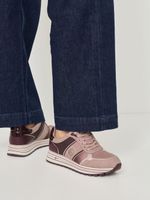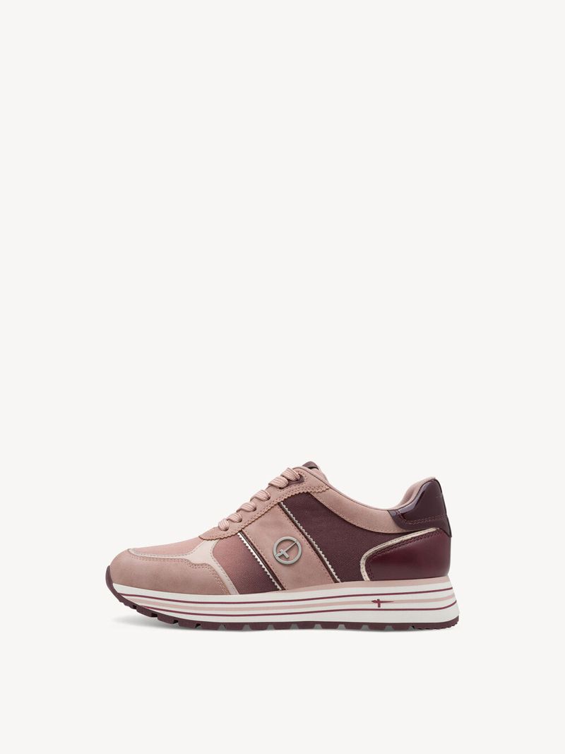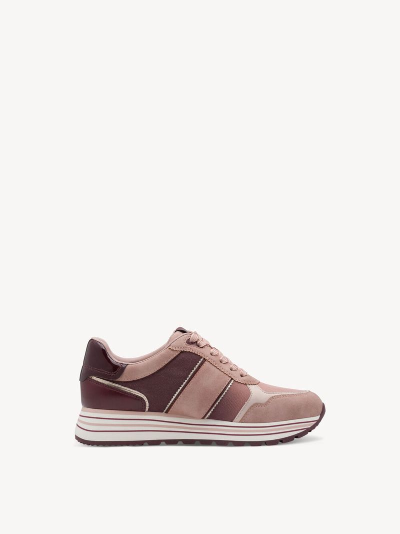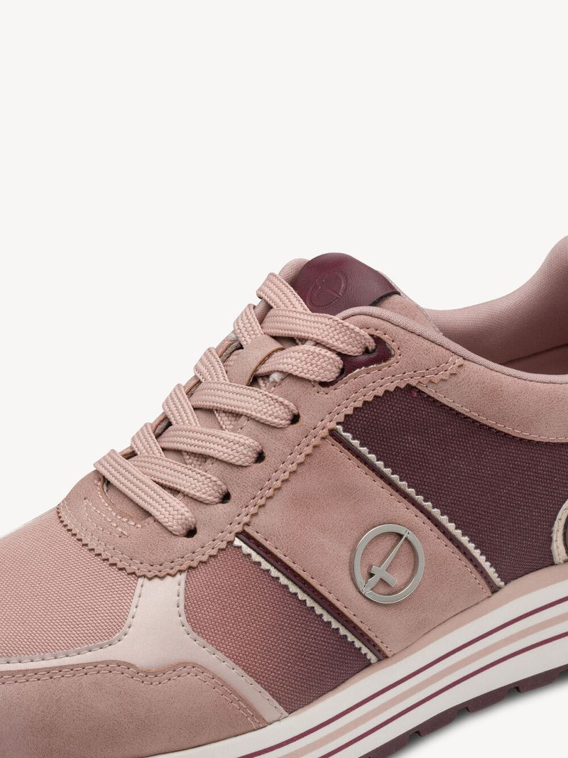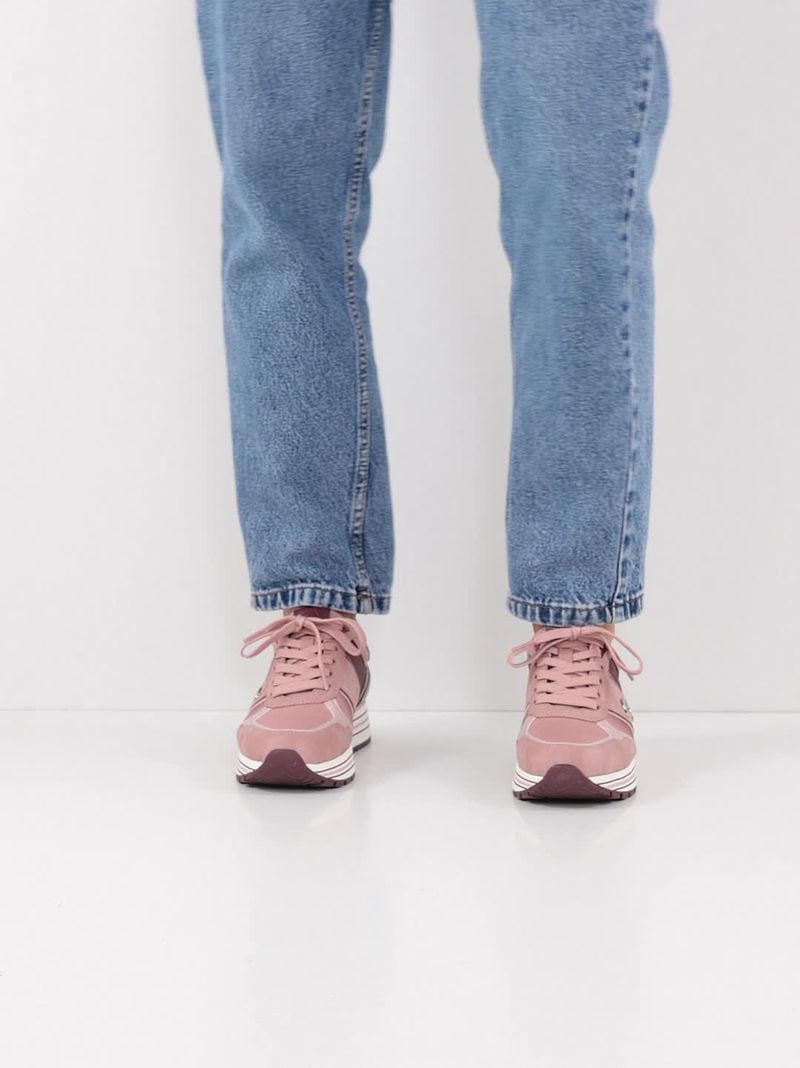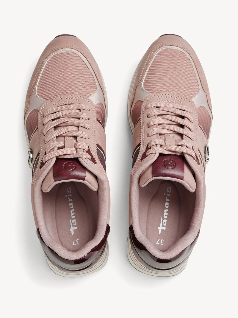 Zapatilla Mujer Tamaris 23727-42 Rosa. Estas zapatillas combinan tonos rosa claro y burdeos para lograr un estilo femenino y actual. El diseño integra materiales como gamuza sintética y textil, con detalles metálicos en el logo y en las costuras que aportan un toque distintivo.