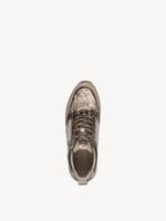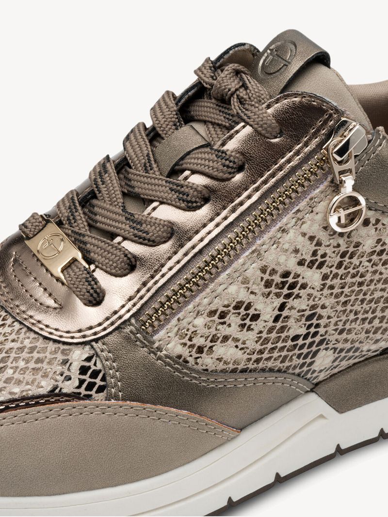 Zapatilla Mujer Tamaris 23732-41 Taupe. Estas zapatillas destacan por su diseño en tonos taupe y textura de efecto reptil en los paneles laterales y la parte frontal, lo que les da un toque original y sofisticado. El modelo incluye cordones a tono y una cremallera lateral para facilitar el calce, así como el logo de la marca en la lengüeta.