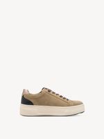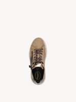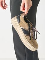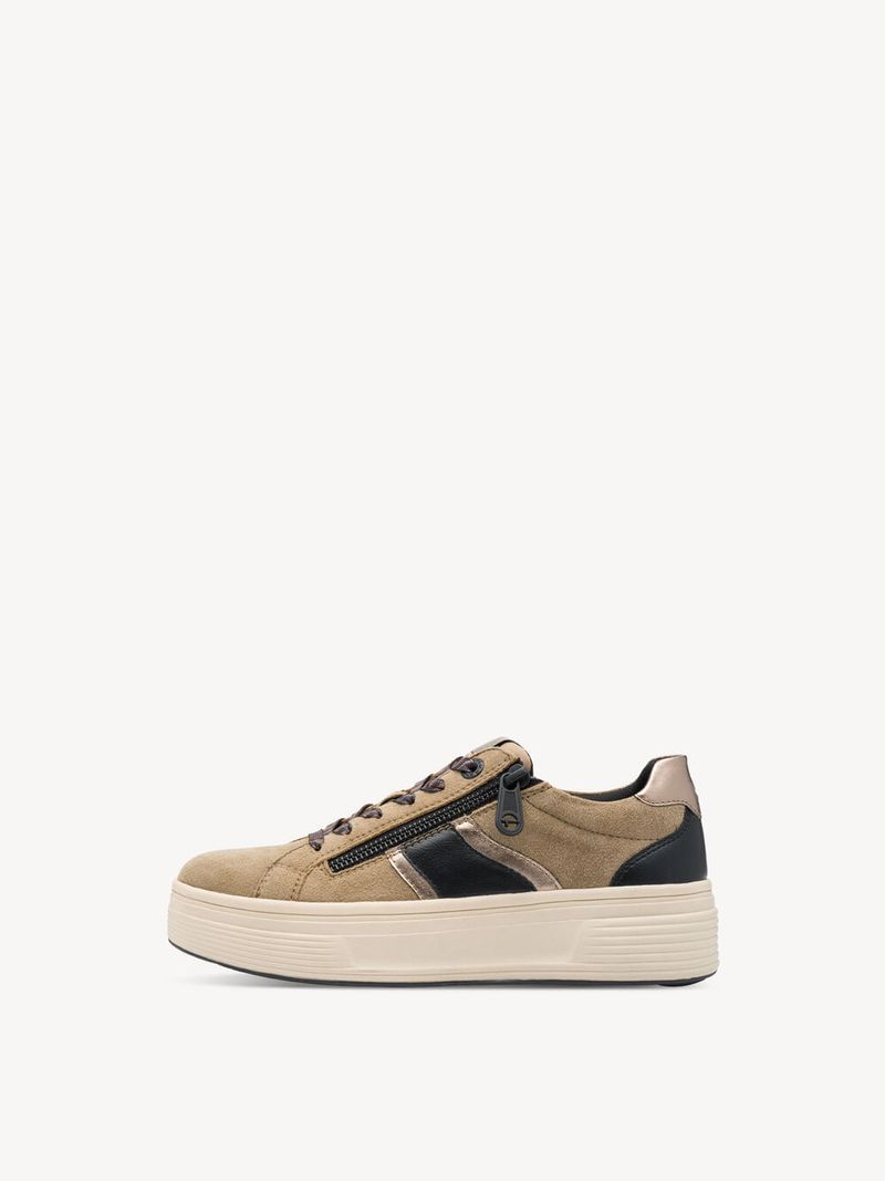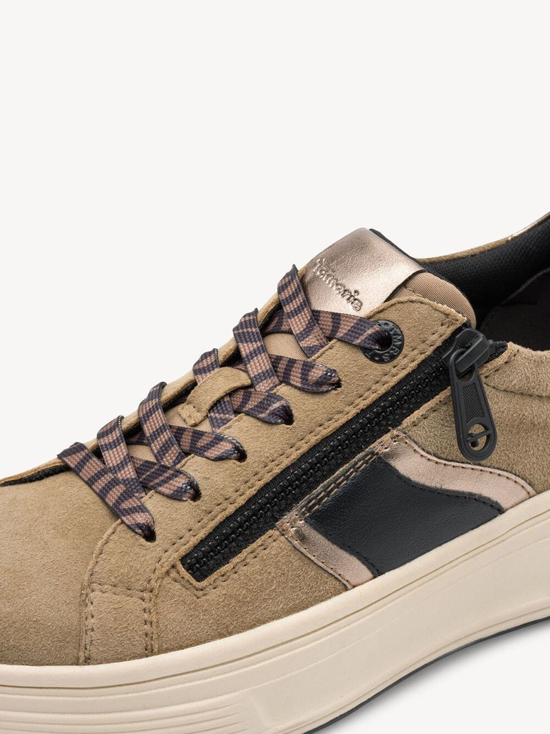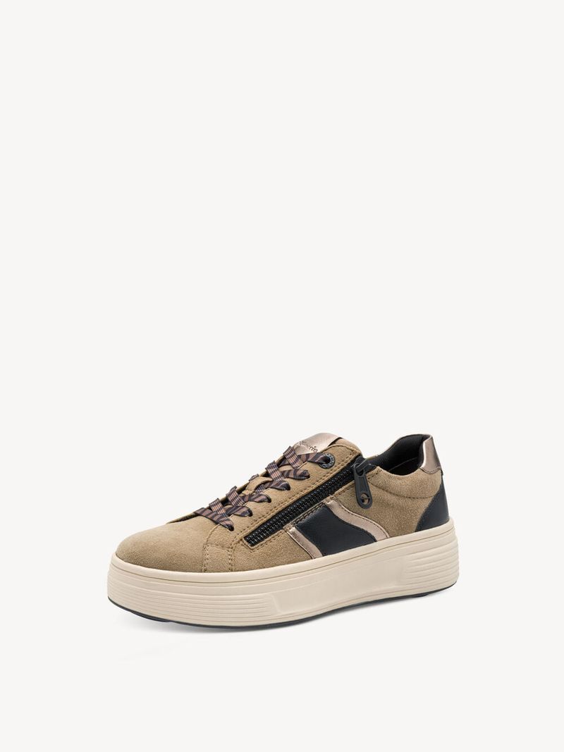 Zapatilla Mujer Tamaris 83716-44 Amarillo Mostaza. Estas zapatillas confeccionadas en cuero destacan por su diseño moderno y minimalista, ideal para looks urbanos y casuales. Presentan detalles metalizados en dorado suave en la cremallera lateral, talón y ribetes, agregando un toque elegante y sofisticado.