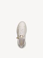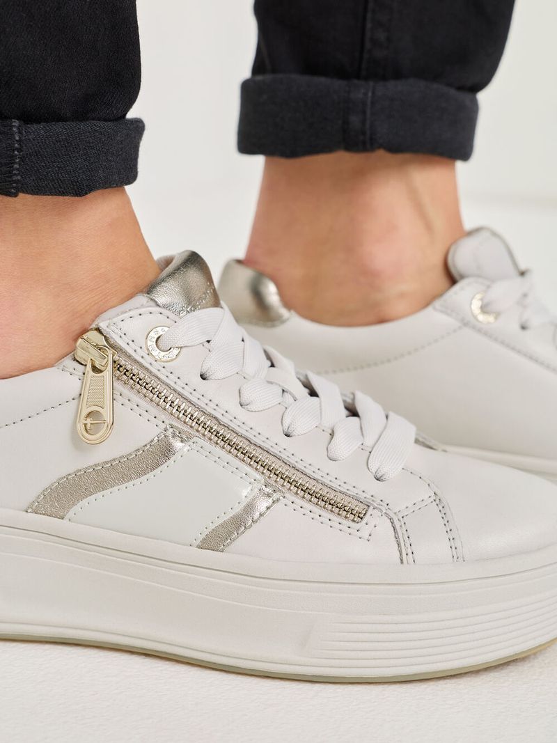 Zapatilla Mujer Tamaris 83716-44 Blanca y Dorado. Estas zapatillas confeccionadas en cuero destacan por su diseño moderno y minimalista, ideal para looks urbanos y casuales. Presentan detalles metalizados en dorado suave en la cremallera lateral, talón y ribetes, agregando un toque elegante y sofisticado.