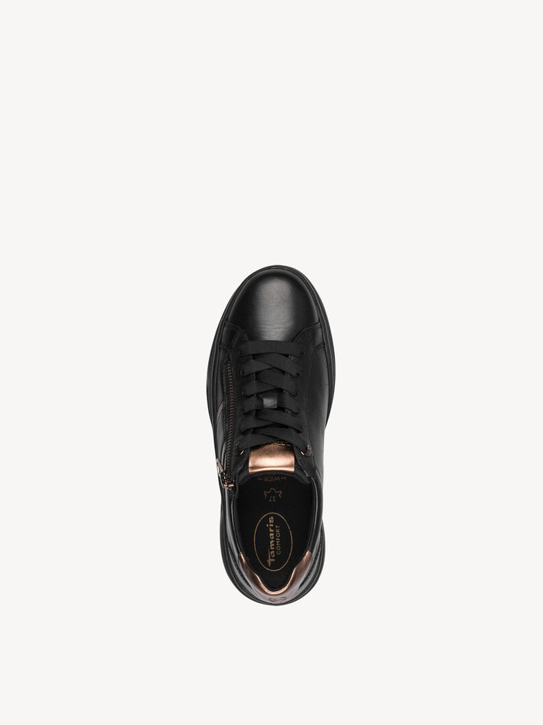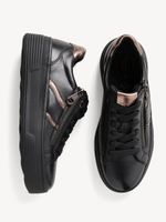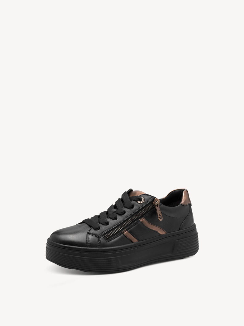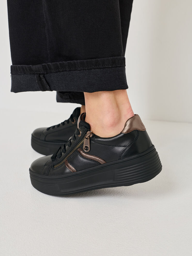 Zapatilla Mujer Tamaris 83716-44 Negra. Estas zapatillas combinan elegancia y funcionalidad con un diseño actual. Incorporan detalles metalizados en bronce en el talón y la lengüeta, así como una cremallera lateral que facilita el calce y aporta un toque moderno.