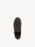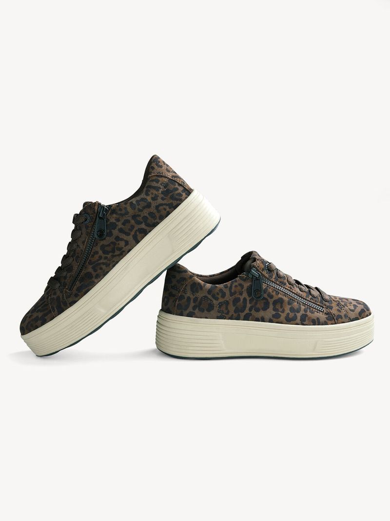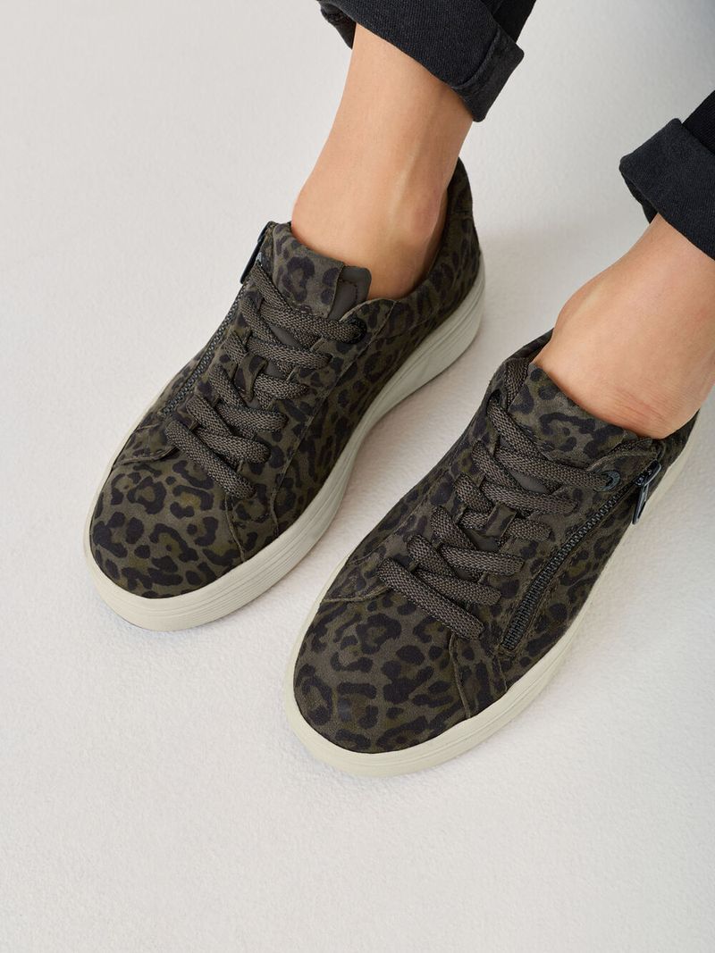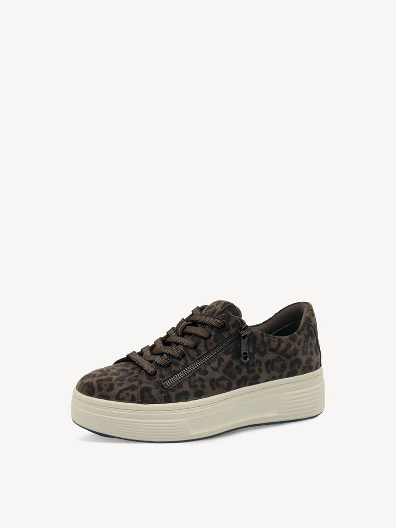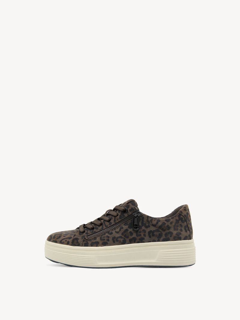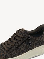Zapatilla Mujer Tamaris 83726-44 Leopardo Mocca. Estas zapatillas confeccionadas en cuero con estampado animal print en tonos marrón y negro, aportando un toque atrevido y actual a cualquier look casual o urbano. Incluyen una cremallera lateral negra y cordones anchos para facilitar el ajuste y sumar estilo al conjunto.