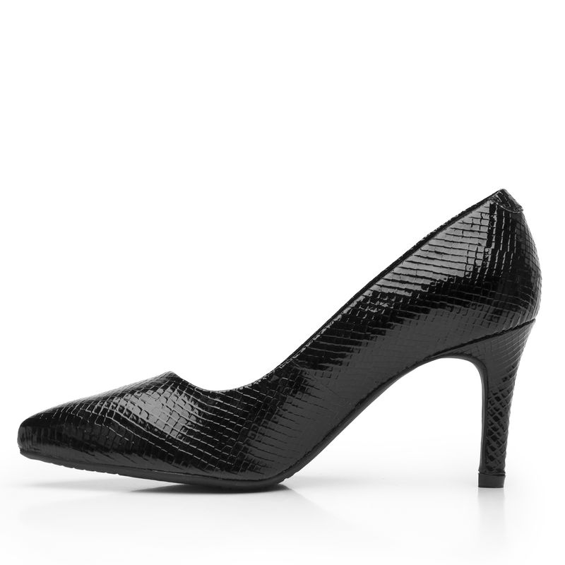 Zapato Mujer Idris 104501 Reptil Negro. Zapato elaborado en ecocuero con textura de escamas que cuenta con el sello de comodidad y estilo de zapatos Flexi. Este producto forma parte de nuestra línea de dama semiformal de horma puntal, un "must" para la temporada que da un look moderno y elegante. Su diseño la hace perfecta para toda ocasión. Esta temporada se renueva con un estilo tipo Mary Jane y charoles que destacan como tendencia. Este calzado cuenta con una suela de abs - tpu / hule, una plantilla de cuero y forro de cuero. Altura 7.4 cm. SKU: 104501ESCAMANEGRO