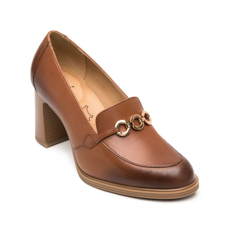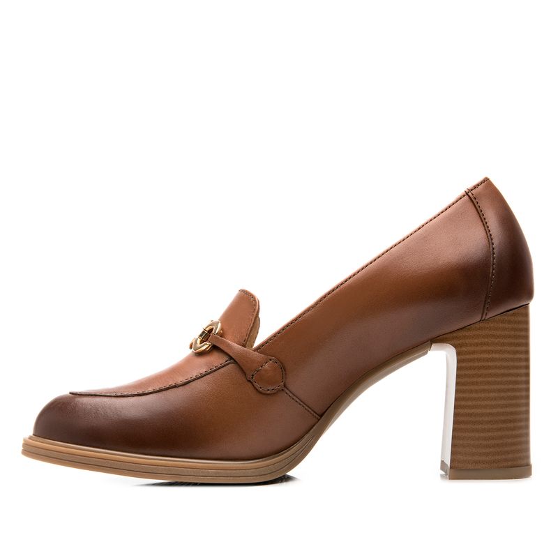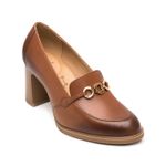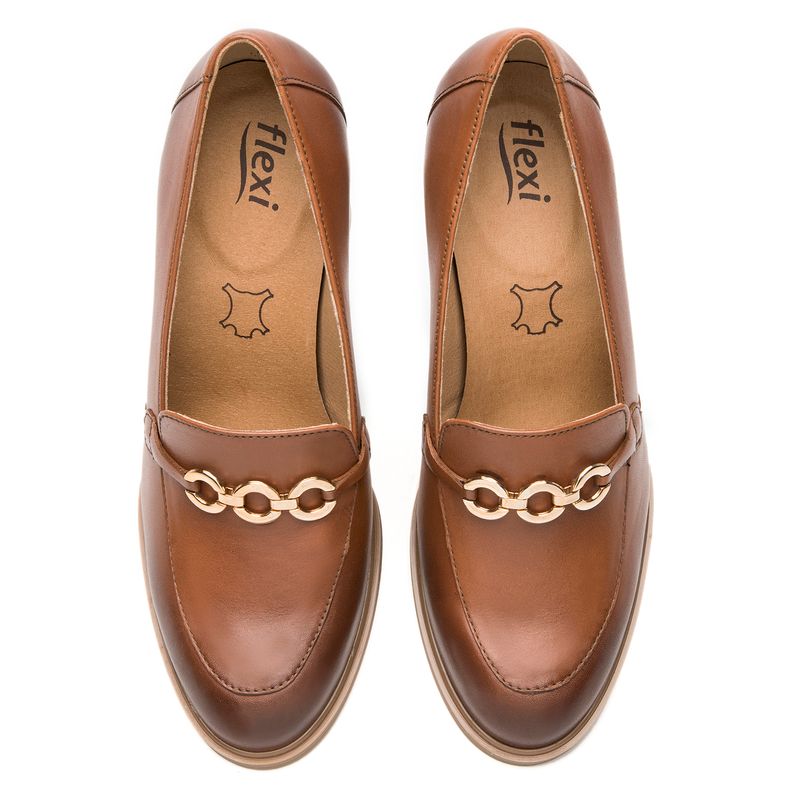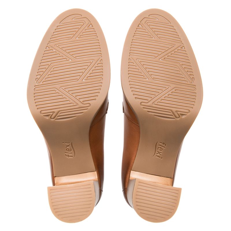 Zapato Mujer Mariela 130605 Café. Zapato tipo mocasín elaborada en cuero natural color negro que cuenta con el sello de comodidad y estilo de zapatos Flexi. Este producto forma parte de nuestra línea de dama semiformal con diseños clásicos, materiales de calidad y detalles que te harán lucir elegante sin sacrificar comodidad gracias a su tacón de bloque que brinda soporte y estabilidad al caminar. Sus detalles como texturas, hebillas y herrajes destacarán en la temporada. Este calzado cuenta con una suela de abs / tpu, una plantilla de cuero y forro ecocuero. Altura del tacón 8cm. SKU: 130605TAN